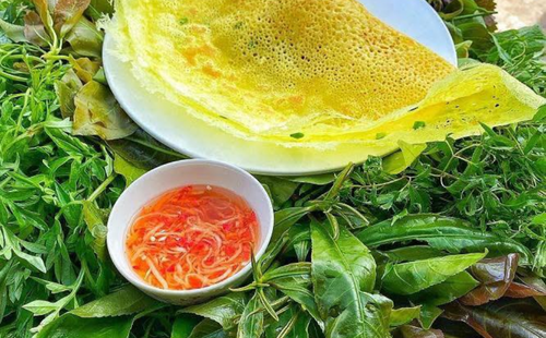 Bánh được đổ vàng giòn, nhân gồm tôm, thịt, giá đỗ, ăn kèm rau rừng, cuốn bánh tráng và chấm nước mắm chua ngọt.